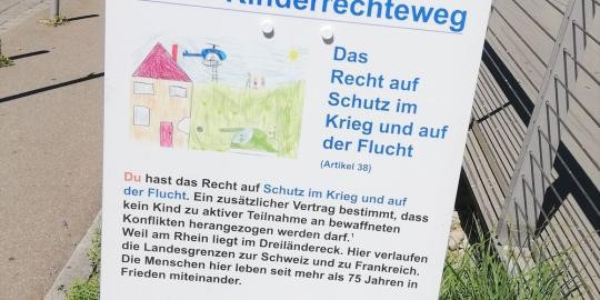 Damit möglichst viele Kinder von den Kinderrechten erfah­ren, wurde im Stadtteil Friedlingen unter der Betei­ligung von Schülerinnen und Schülern der Rhein­schule „Unser Kinder­rechte­weg“ entwickelt. Nun kannst Du diesen kleinen Rundweg, der Dich an der Rheinschule und am Rheinpark vorbei­führen wird, zusammen mit Freunden, der Klasse oder Deiner Familie erforschen und vieles über die Kinderrechte lernen.