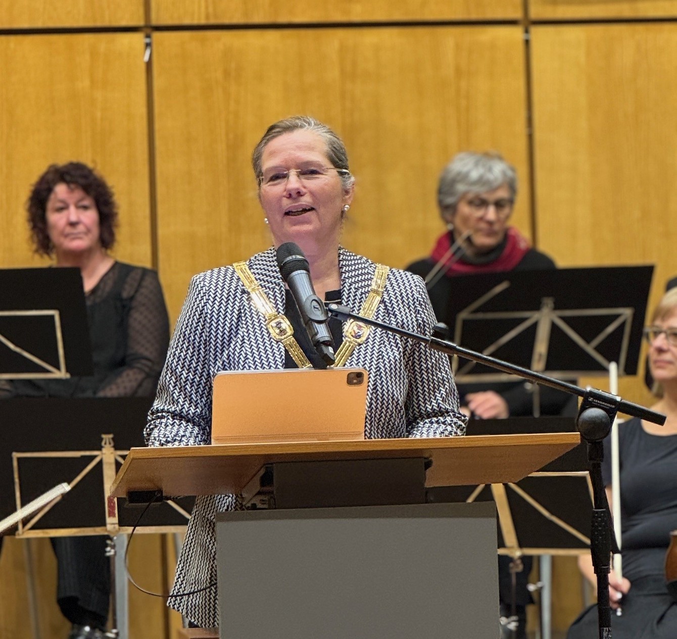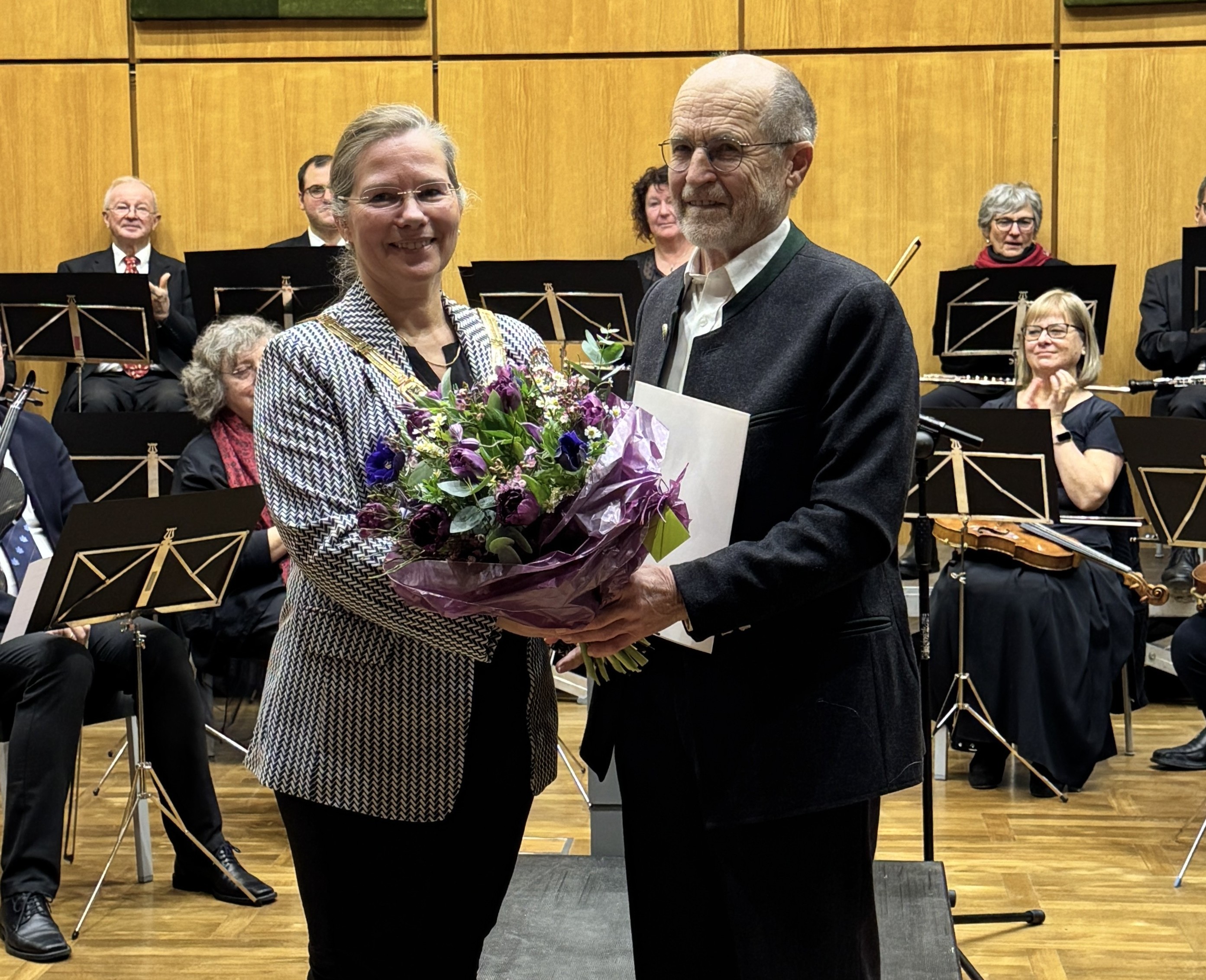 Der Große Sitzungssaal war mit 500 Gästen wieder bis auf den letzten Platz gefüllt und festlich dekoriert. Den würdigen Rahmen dieses sehr bedeutsamen Ereignisses in der 3-Länder-Stadt bildeten zudem die ebenso bewährte wie spielfreudige Orchestergesellschaft Weil am Rhein unter der Leitung von Franck Nilly sowie die Geschwister Julia und Anna Dietsche. Die beiden Musikschülerinnen verzückten mit dem Hackbrett das Publikum musikalisch. Einmal mehr ein echtes Erlebnis. Der Applaus war groß.