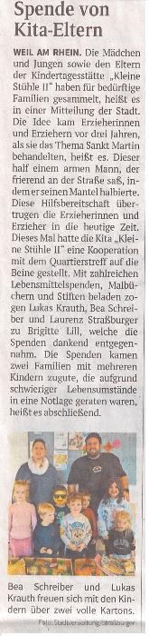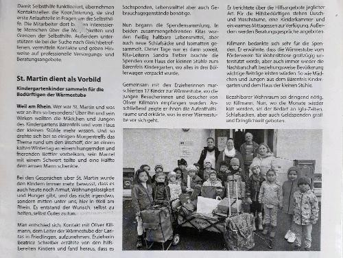 Ein bisschen so wie Martin wollten unsere Kinder sein. Da wir noch in unserem Übergangkindergarten in Friedlingen waren hat es sich angeboten für die Wärmestube spenden zu sammeln. Es kam dank der Eltern einiges zusammen, so dass wir so wie Sankt Martin unseren Mitmenschen, die nicht so viel haben wie wir, etwas guten machen konnten.