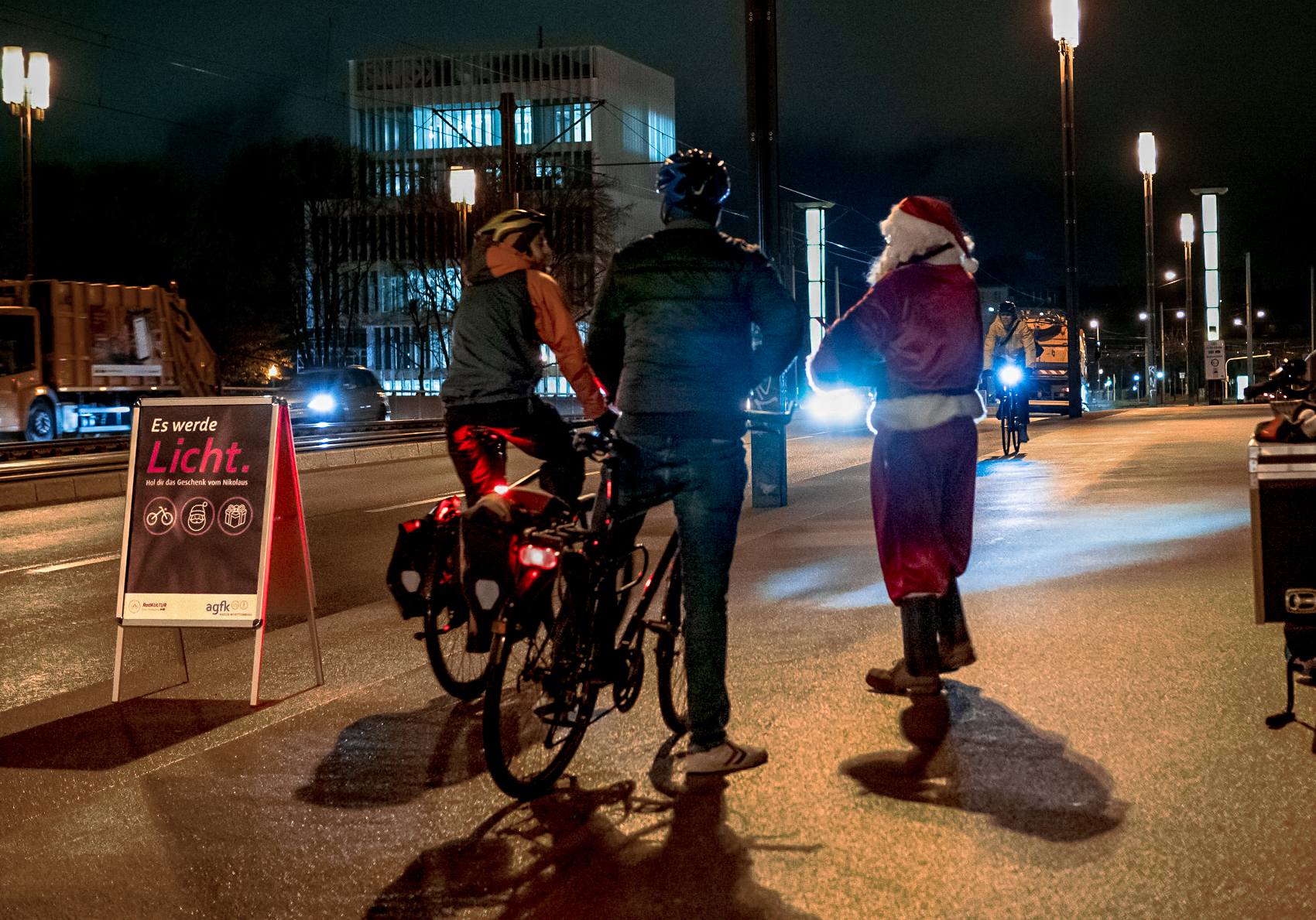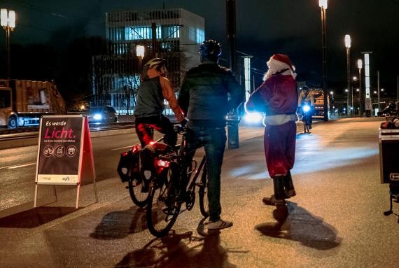 Gut sichtbar und beleuchtet: Mit einer gut eingestellten und funktionierenden Fahrradbeleuchtung unterwegs zu sein oder als Fußgängerin oder Fußgänger helle Kleidung und Reflektoren zu tragen, wird dieses Jahr an Nikolaus besonders belohnt.