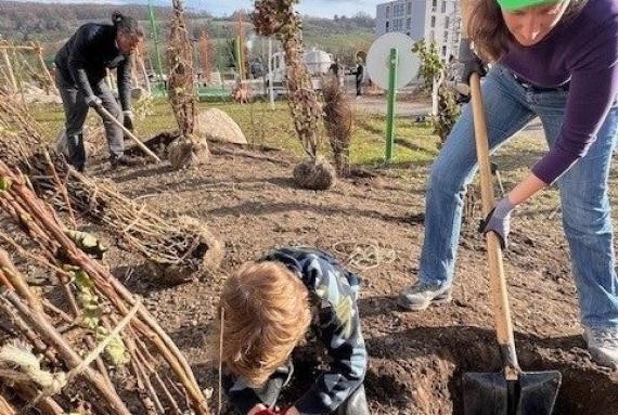 Spieren, wilde Johannisbeeren, Blasensträucher, Weiden und Rosmarinweiden – allesamt robuste und ungiftige Arten fanden auf der rund 6600 Quadratmeter großen Fläche, die künftig als Aktions- und Naturerfahrungsraum dient, ihr neues Plätzchen. Groß und Klein gruben Löcher in die Erde, setzen die Setzlinge ein und gossen diese schließlich unter Anleitung der Mitarbeitenden der Stadtgärtnerei und der Grünplanung fachmännisch an.
