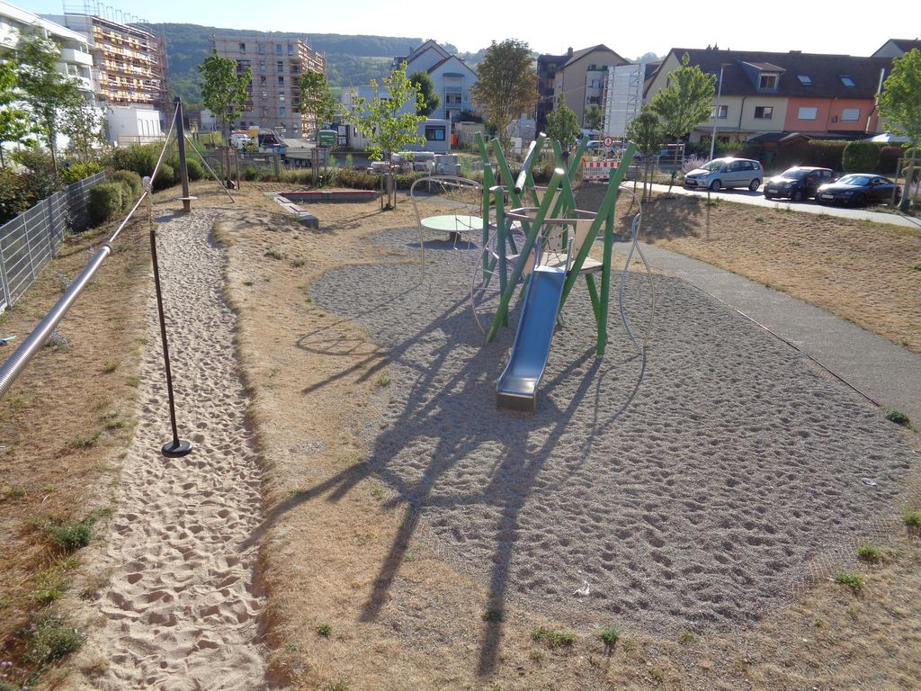 Alter: 3 – 14 JahrenAusstattung: Sitzbänke, Picknick -Sitzgruppe, Sitzarena Halbschatten, SonneSpielgeräte: Sandkasten, Wipptiere, Dialogschaukel, Hangrutsche, Murmelspielfeld, Kombinationsanlage "Feuerwehr"