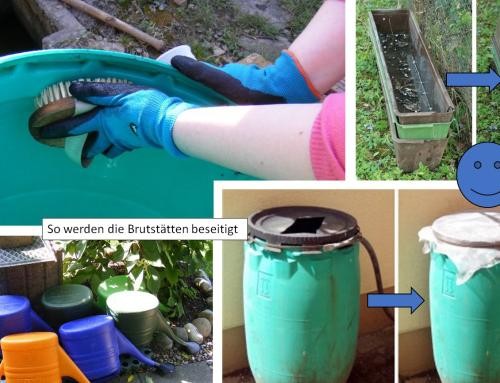 Bitte vermeiden Sie jedes offene Wasser auf Ihren Freiflächen: Verschließen Sie Gefäße, in denen sich Wasser sammeln kann, mit Netzen (herkömmliche Insektennetze für Fenster). Oder sorgen Sie dafür, dass kein Wasser stehen bleiben kann, indem Sie dafür sorgen, dass Wasser immer ablaufen kann (z. B. an Regenrinnen oder Abdeckplanen). Drehen Sie dafür Gefäße um oder räumen Sie sie am besten an einen Ort, wo kein Wasser hinkommen kann (Abstellräume).